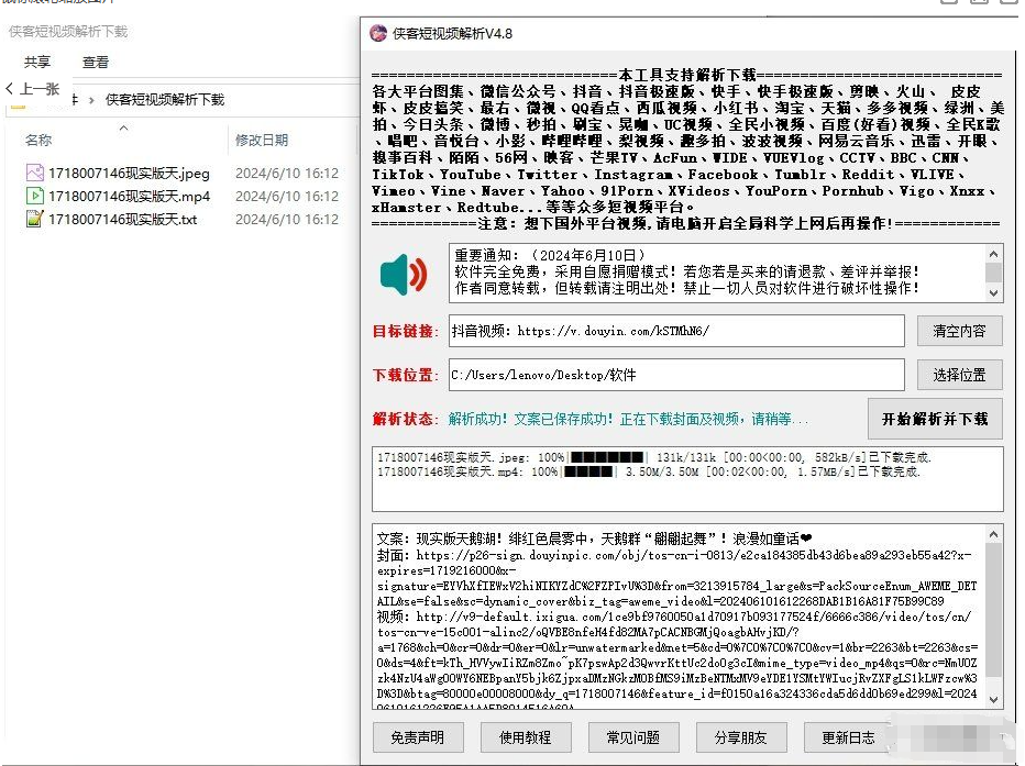 软件介绍 本工具支持无水印解析下载抖音、抖音极速版、快手、快手极速版、剪映、火山、皮皮虾、皮皮搞笑、最右、微视、QQ看点、 ...